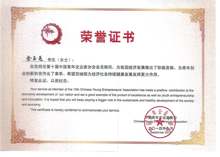 公司董事長(zhǎng)金玉兔先生榮獲“中國(guó)青年企業(yè)家協(xié)會(huì)”榮譽(yù),感到無上榮光,在擔(dān)任第十屆中國(guó)青年企業(yè)家協(xié)會(huì)會(huì)員期間,積極參與青年就業(yè)創(chuàng)業(yè)、環(huán)境保護(hù)、扶貧濟(jì)困等社會(huì)公益和抗災(zāi)救災(zāi)等工作,抓住機(jī)遇,開拓進(jìn)取,以更加昂揚(yáng)的精神狀態(tài),積極投身經(jīng)濟(jì)建設(shè)的主戰(zhàn)場(chǎng),不斷創(chuàng)造輝煌的業(yè)績(jī),同時(shí)也表示一定努力承擔(dān)好青年企業(yè)家的社會(huì)責(zé)任感,更好的為經(jīng)濟(jì)社會(huì)持續(xù)健康發(fā)展發(fā)揮更大作用,為構(gòu)建和諧社會(huì)做貢獻(xiàn)。