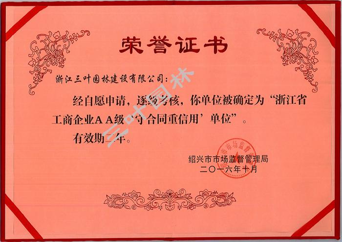浙江省工商企業(yè)AA級“守合同重信用”單位認定每三年一次,自2007年以來,三葉園林連續(xù)第四次獲得該項榮譽。公司將珍惜該榮譽,更加重視合同信用管理,提高合同信用管理現(xiàn)代化水平,提升合同管理層次,守法經(jīng)營,誠信經(jīng)營,為推進我市經(jīng)濟健康發(fā)展做出新貢獻。